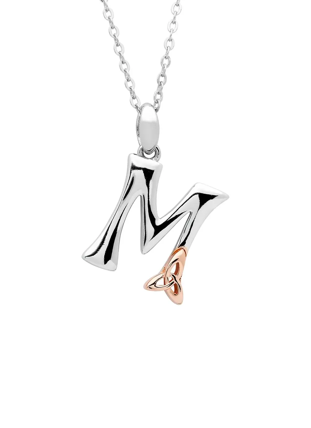 Show the world the initial that means the most to you; is it your own, or the one you love? This sterling silver necklace features a single initial beautifully designed with a rose gold plated trinity knot. The perfect meaningful gift for you or someone special.