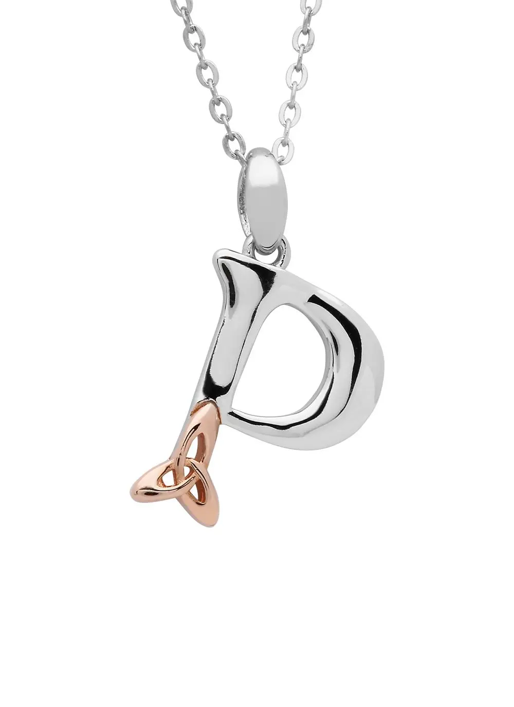 Show the world the initial that means the most to you; is it your own, or the one you love? This sterling silver necklace features a single initial beautifully designed with a rose gold plated trinity knot. The perfect meaningful gift for you or someone special.