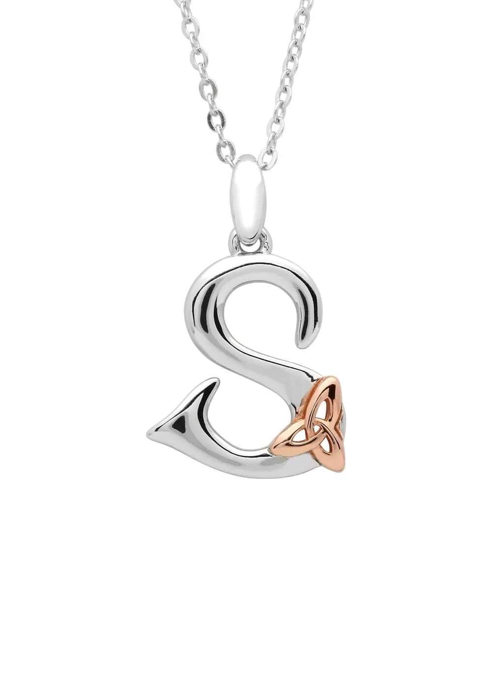 Show the world the initial that means the most to you; is it your own, or the one you love? This sterling silver necklace features a single initial beautifully designed with a rose gold plated trinity knot. The perfect meaningful gift for you or someone special.