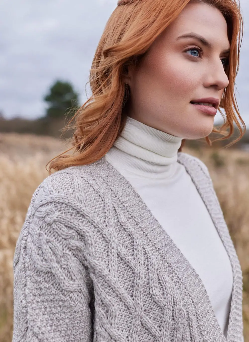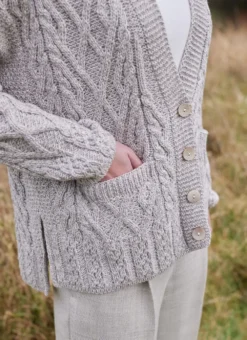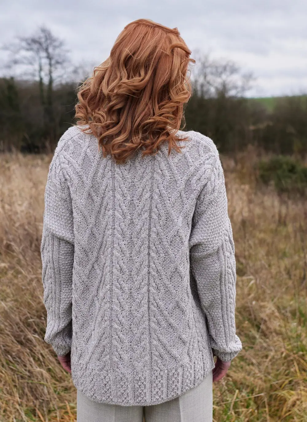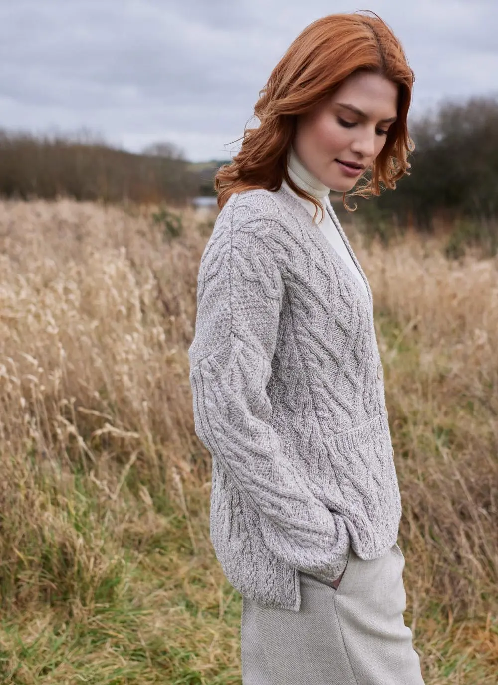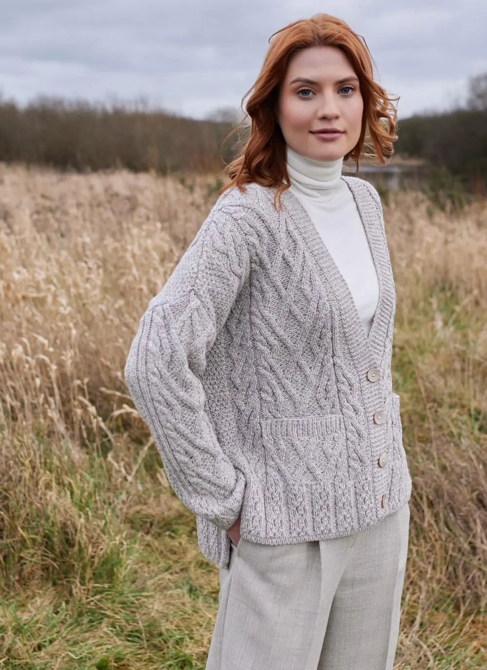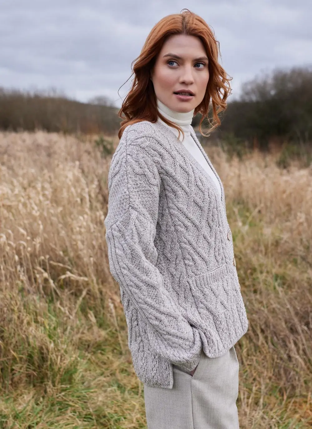 This boxy cardigan is knit from our signature supersoft merino wool that feels luxurious to the touch. Made in Ireland, it features traditional Aran trellis stitching whose roots date back to the 19th century. Contemporary yet ageless, an asymmetrical hem and two side slits add style and interest. Beautifully finished with buttons and two pockets.