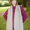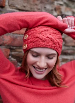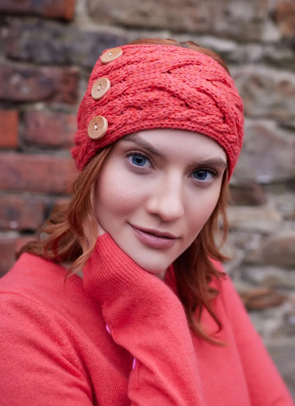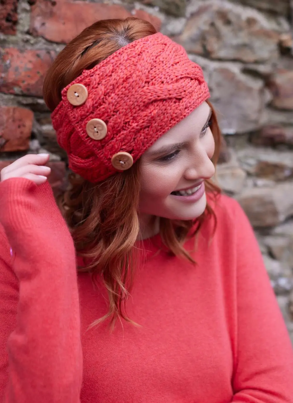 Cute and cozy, this headband is knit with supersoft merino wool. It features traditional Aran stitching for a distinctly Irish look. Fastened with three contrasting brown buttons.