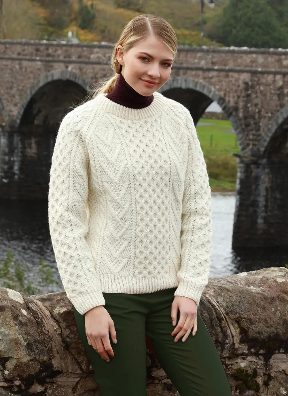 One of our enduringly popular designs, this classic Aran crew neck sweater is hand-knit with pure, premium merino wool. The traditional Aran stitches include cable and honeycomb, and the sweater has been knitted as it was hundreds of years ago, with each stitch telling its own story. A casual and comfortable knitwear layer that will never go out of style.