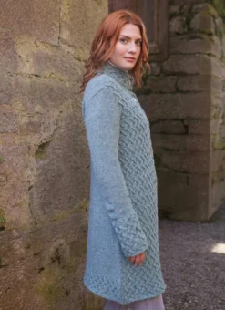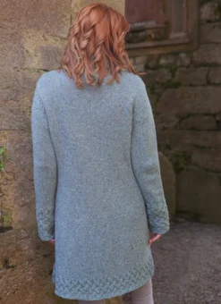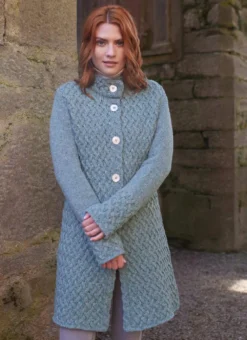 Our elegant Aran coatigan has distinctive trellis stitching on the front, cuffs and hems. Knit in Ireland, it is beautifully soft thanks to the wool and cashmere blend yarn with a Donegal fleck. It has a high collar and is fastened with four large pearly buttons.