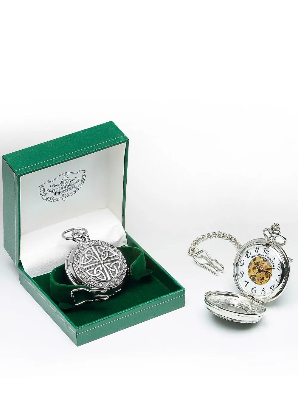 This charming Irish wind up watch features the iconic Trinity Knot symbol. It is a timeless classic, designed to replicate the look of a gents pocket watch in the early Victorian period. The pocket watch functions from a manual wind up. Simply push the top button to reveal the magnificent clock face, which had a transparent center allowing you to see the inner workings of the watch. Secure the pocket watch with an easy fasten clip.