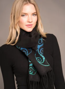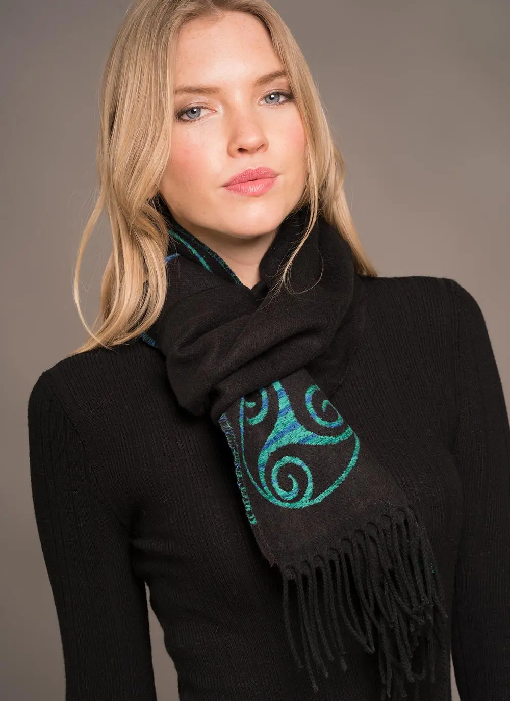 This fringed scarf features Celtic spiral motifs with a triskele symbol, which dates back to ancient Ireland. A stylish scarf, this is sure to keep you warm and cozy throughout the seasons.