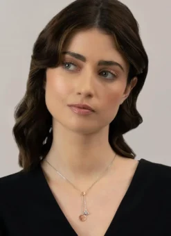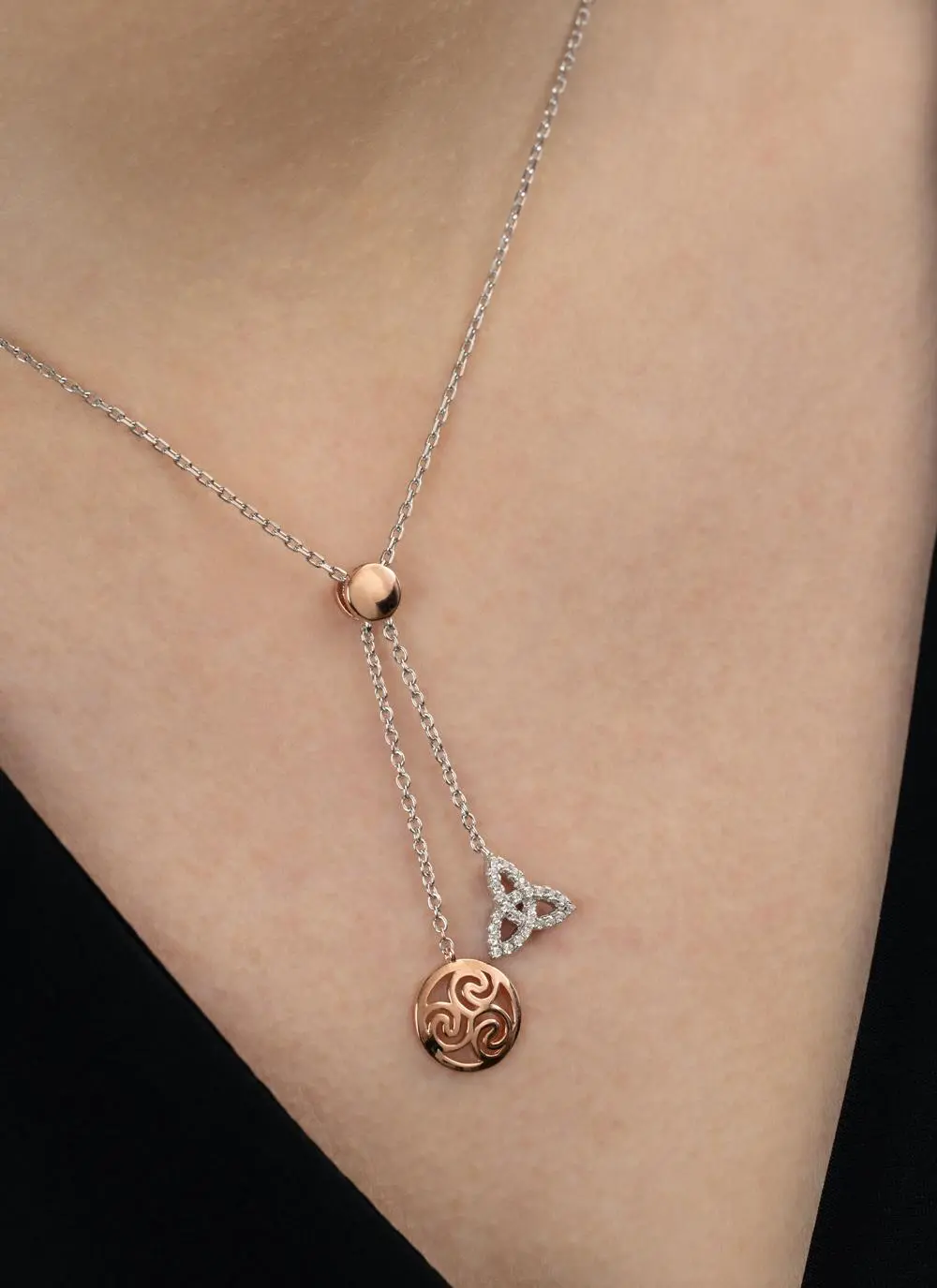 Turn heads with this exquisite two-drop pendant in sterling silver and rose gold. This stunning piece features two drop charms – a rose gold triskele and a Trinity knot adorned with dazzling cubic zirconia stones. A perfect Irish gift.