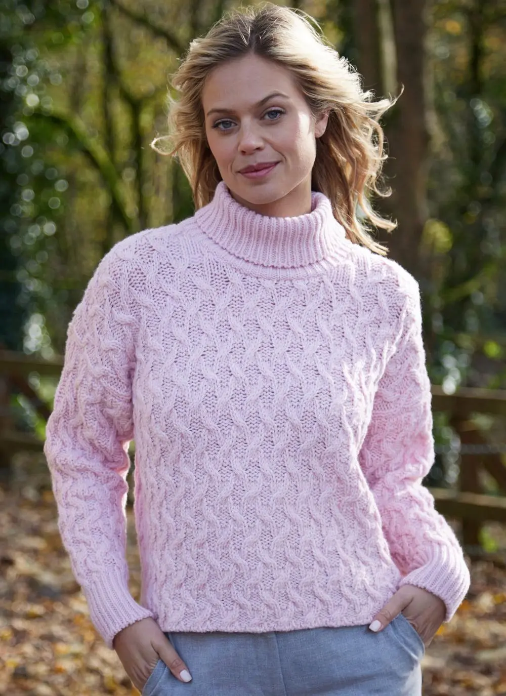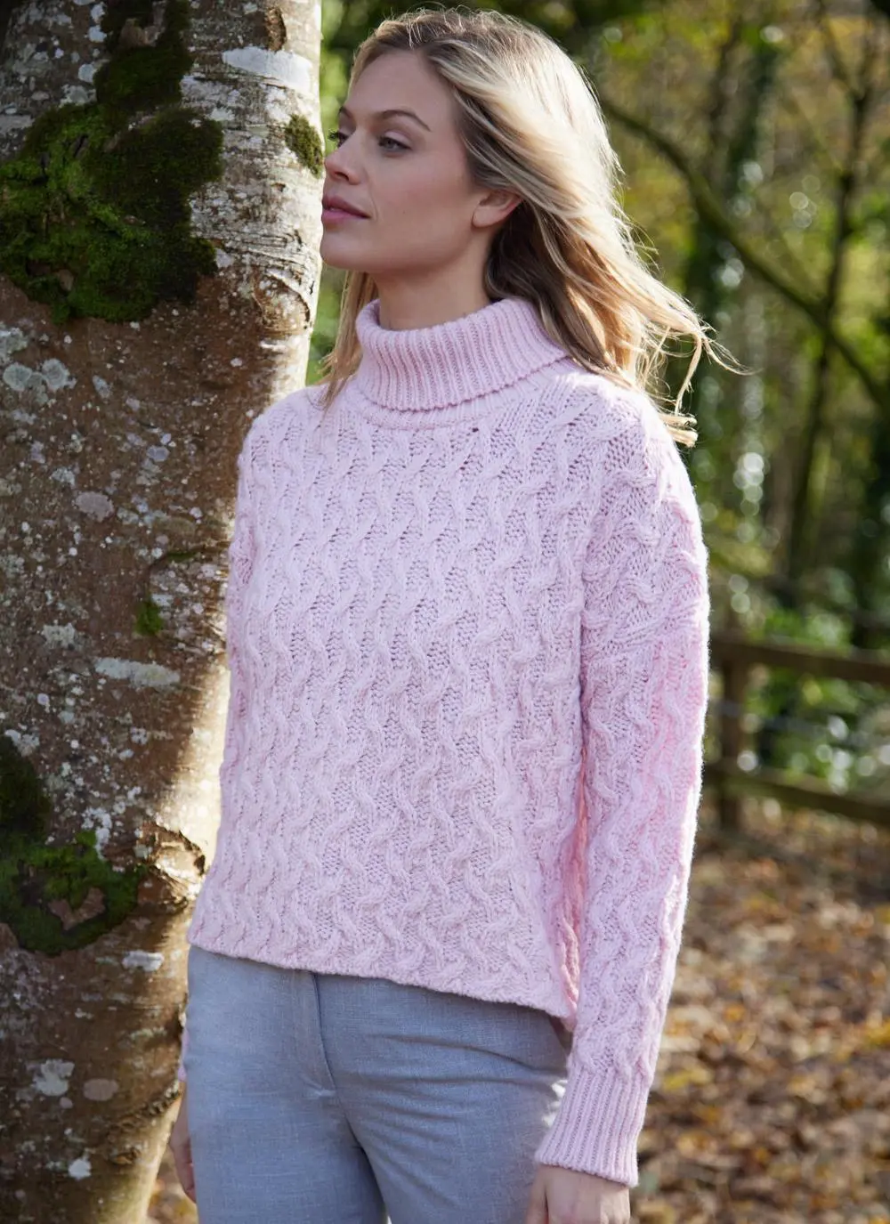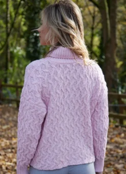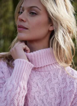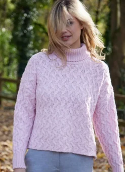 Feminine and flattering, this cropped turtleneck Aran sweater has enduring appeal. It is made in Ireland in a premium wool-cashmere blend that feels luxuriously soft to the touch. Finished with an all-over cable pattern and ribbed stitching on the cuffs and neckline.